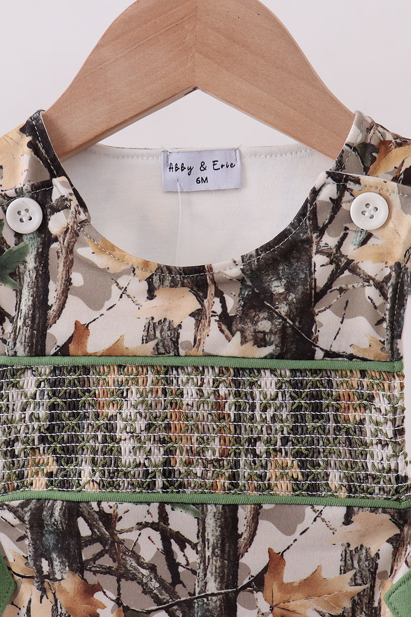 Gear up your little one in style with this camouflage smocked jonjon! Featuring classic camo patterns and charming smocked detailing, this traditional piece blends timeless design with modern flair. Perfect for playdates, family gatherings, or everyday adventures, it's comfortable enough for all-day wear. The smocking adds a touch of whimsy while the durable fabric keeps up with active kids. A wardrobe essential that's equal parts fun and functional!
