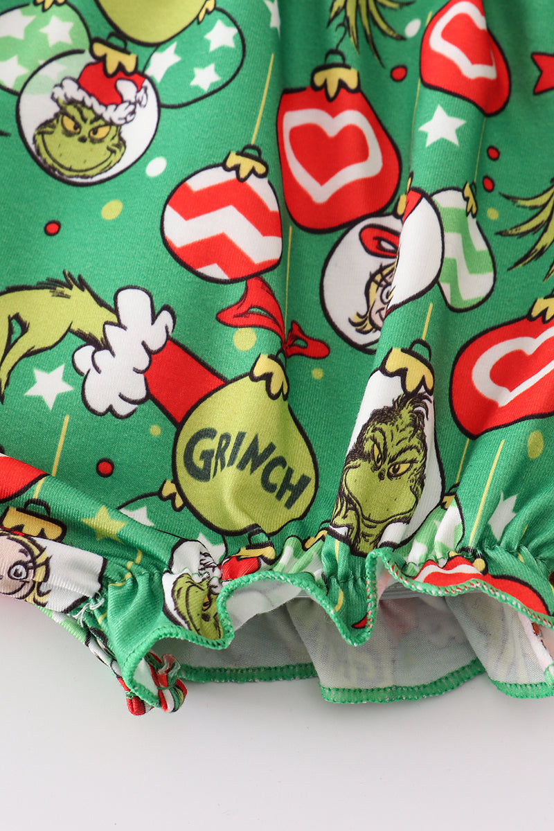 Transform your little one into a festive Grinch in this playful green ruffle bubble. The quirky print and playful ruffles make this outfit a fun addition to any holiday gathering. Embody the playful and mischievous spirit of the Grinch with this unique piece.