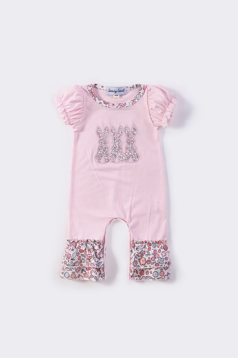 Hop into style with this adorable pink bunny applique floral romper for girls. Made with love, this romper features a playful bunny design and vibrant floral pattern, perfect for any little fashionista. So cute, it'll make you want to hop, skip, and play all day!