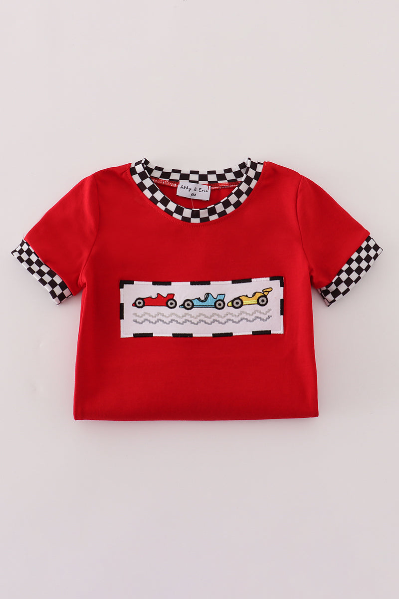 Red racing car embroidery checkered romper
